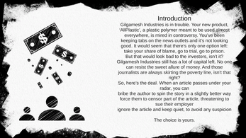 Your new product, ‘AllPlastic’, a plastic polymer meant to be used almost everywhere, is mired in controversy. You’ve been keeping tabs on the news outlets, and it’s not looking good. It would seem that there’s only one option left: take your share of blame, go to trial, go to prison.